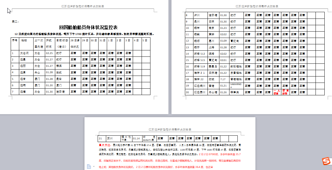 嚴(yán)格監(jiān)測排查。每天由專人負(fù)責(zé)對(duì)每名船員進(jìn)行體溫測量,建立“防疫工作日志”。對(duì)有類似癥狀的船員,做好預(yù)防隔離,密切跟蹤身體健康狀況,并及時(shí)向公司通報(bào)船員癥狀。對(duì)于靠泊期間發(fā)現(xiàn)任何外來人員有類似感冒、咳嗽、發(fā)燒等癥狀時(shí),立即驅(qū)離船舶并同時(shí)通知代理和工頭或有關(guān)管理部門處理。