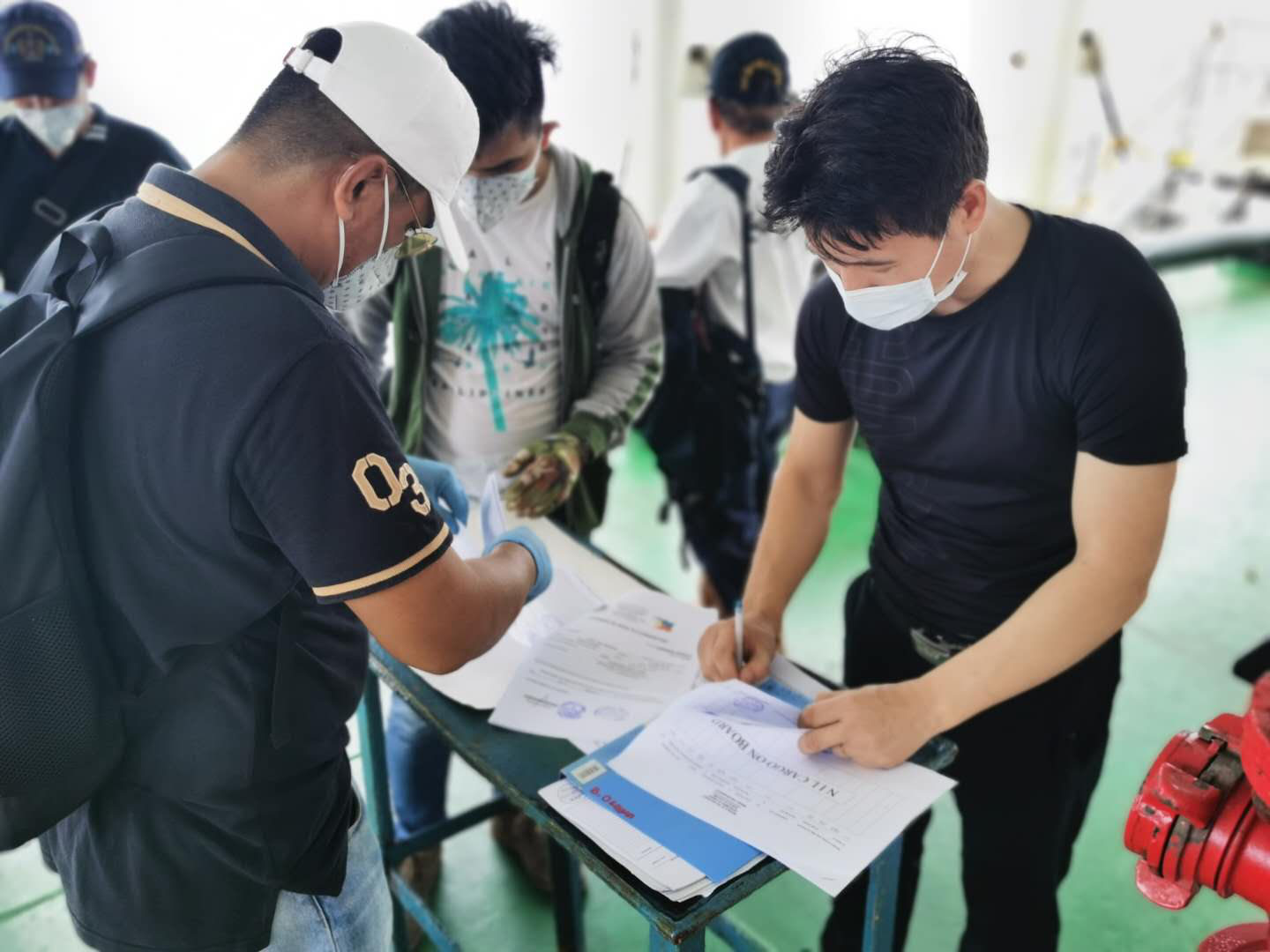 圖為江遠(yuǎn)福州輪抵達(dá)菲律賓港口時衛(wèi)檢官員不進(jìn)船艙,在室外辦理手續(xù)