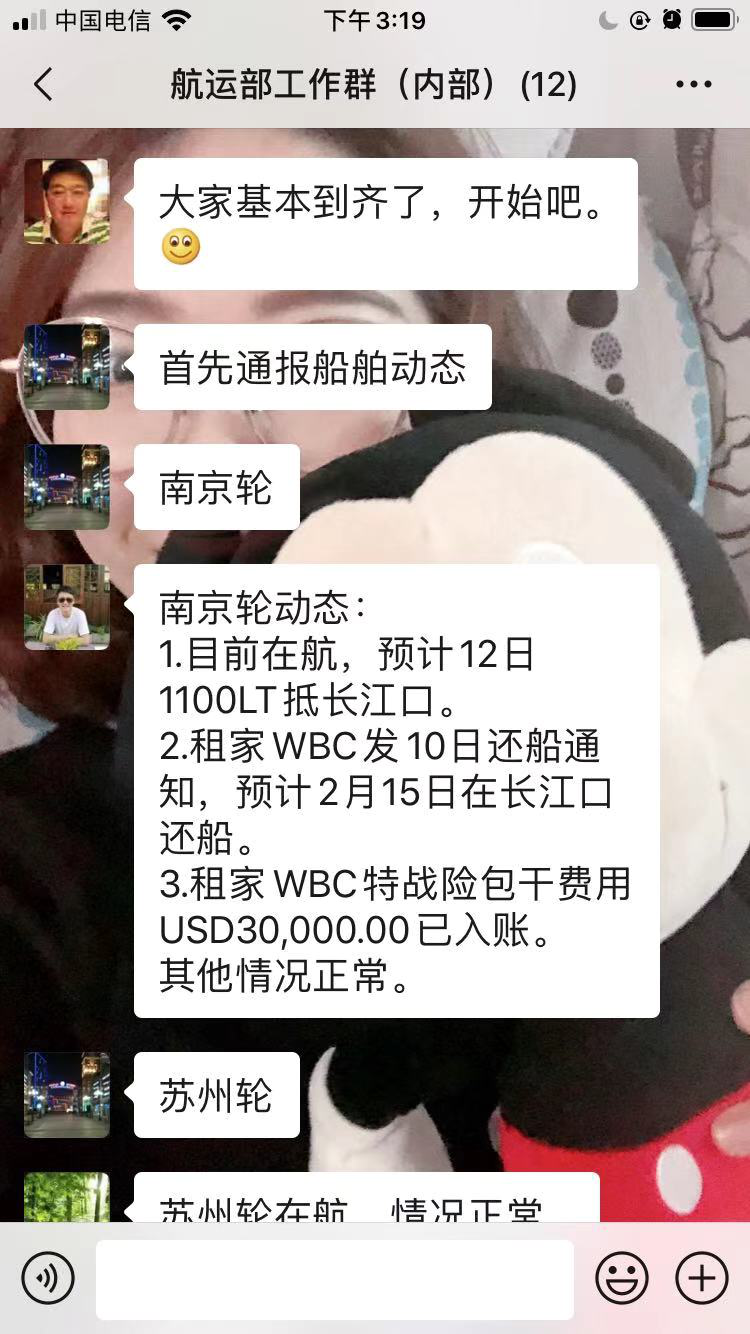 堅持每天總結(jié)布置。即便是假期,航運部負(fù)責(zé)人堅持每天上午9時準(zhǔn)時通過微信工作群召開工作總結(jié)布置會議,業(yè)務(wù)主管通報各國各地區(qū)各港口對來自中國港口船舶的檢驗檢疫限制措施變動信息,所管船舶動態(tài)、員工個人健康狀況,并就實際問題展開交流。