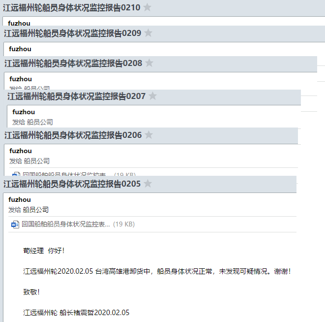 同疫情搶時間。公司多次緊急通電船舶,全面部署、詳細指導(dǎo)船舶的防疫工作,要求各輪精心組織、迅捷高效,做好每一位在船船員身體狀況摸排,認真落實疫情防控工作,實行船員健康“日匯報”制度,密切關(guān)注、確保船員的身體健康和船舶安全雙穩(wěn)定。