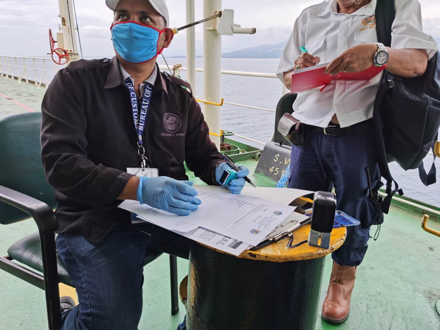 1月29日,菲律賓VILLANUEVA港,“江遠德州”輪嚴格消毒,船員禁止下舷梯,衛(wèi)檢人員檢查通過后代理和官員上船辦理進口手續(xù)