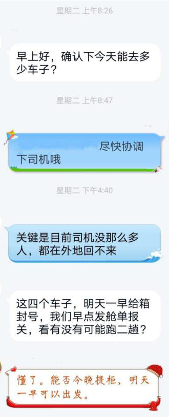 出現(xiàn)突發(fā)狀況時,他們齊心協(xié)力、出謀劃策、掃除障礙。2月12日,為節(jié)省時間,物流組安排晚上提空箱,以便第二天一早能去工廠裝箱。然而到了晚上9:00,因規(guī)定的提箱堆場下班,車隊不能提箱。物流組當機立斷,緊急聯(lián)系運營部箱管同事,運營部積極響應,與相關方溝通協(xié)商,共同解決難題,成功更改提箱地點,9:35車隊順利完成提箱任務。