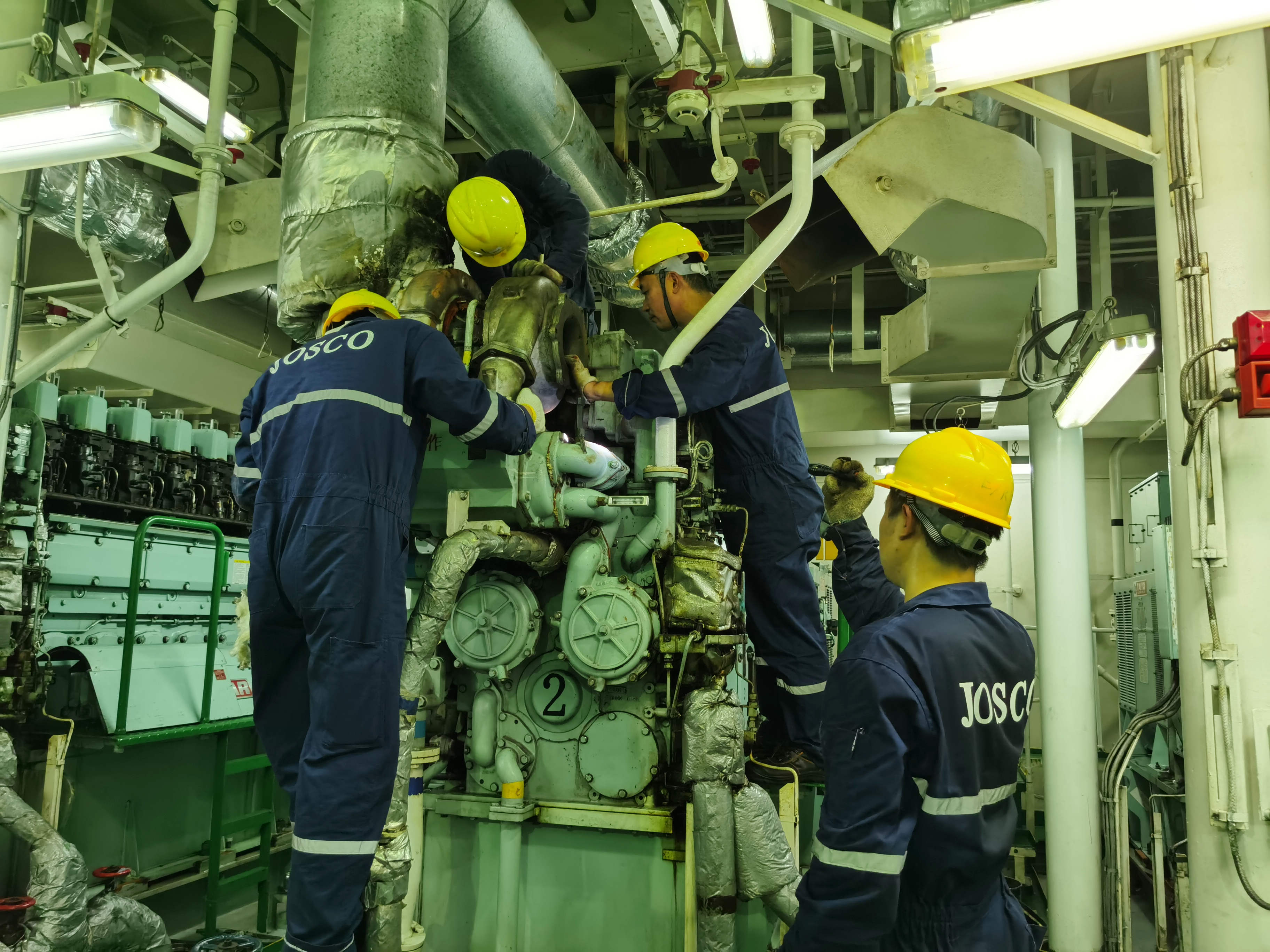 此時(shí)已是深夜,江蘇遠(yuǎn)洋岸基團(tuán)隊(duì)同樣熬著夜、懸著心。經(jīng)過船上和岸基管理團(tuán)隊(duì)共同研究,為確保萬無一失,決定同時(shí)進(jìn)行兩套搶修方案。方案一,焊接、修理損壞的舊水套,再安裝并進(jìn)行封缸運(yùn)行;方案二,用砂紙打磨新水套內(nèi)圈、調(diào)整尺寸,再安裝、進(jìn)行封缸運(yùn)行。在輪機(jī)長陸蘭峰、大管輪孟濤帶領(lǐng)下,機(jī)艙全體人員默契配合,徹夜未眠、連續(xù)奮戰(zhàn),每個(gè)人的眼睛里都因焦急、熬夜而布滿血絲。一場困難重重的“終極賽跑”終于在船上時(shí)間11月20日迎來勝利的曙光。舊水套經(jīng)過焊接修理后,被成功安裝。此時(shí),所有人都舒了一口氣,船暫時(shí)安全了。但出于對(duì)船航行安全的長遠(yuǎn)考慮,大管輪孟濤建議將舊水套拆除,換上打磨好的新水套。奮戰(zhàn)一夜,大家都已經(jīng)疲倦異常。但考慮到用舊水套封缸運(yùn)行也存在很大風(fēng)險(xiǎn),還要抵抗后續(xù)海上的惡劣天氣。于是,大家果斷決定,采納孟濤的建議,拆掉舊水套、重新安裝新水套。有了前面的安裝經(jīng)驗(yàn),在經(jīng)過多次調(diào)試調(diào)整后,新水套被成功裝到了5號(hào)發(fā)動(dòng)機(jī)缸頭上。那一瞬間,鋪天蓋地的喜悅充滿了整個(gè)機(jī)艙,慶幸、感動(dòng)還有滿滿的激動(dòng)洋溢在21個(gè)兄弟之間。